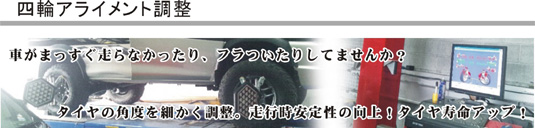 四輪アライメント調整。タイヤの角度を細かく調整。走行時安定性の向上!タイヤ寿命アップ! |